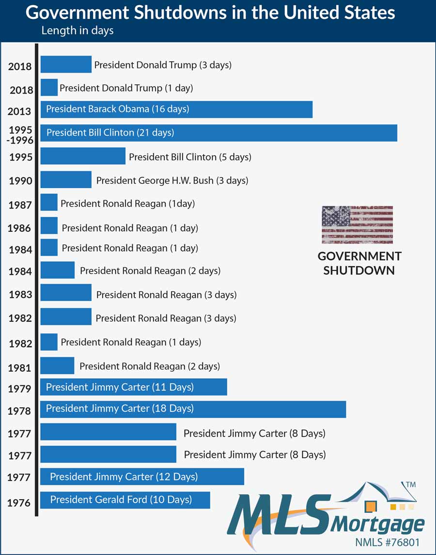 The below chart shows the history of US Government Shutdowns with the length of time from 1976 through 2018.